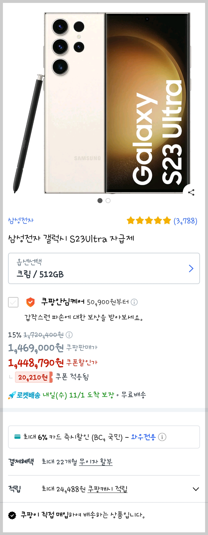 자급제폰을 구매할 수 있는 방법은 삼성 공식 홈페이지 또는 쿠팡이나 11번가 등의 온라인 마켓에서 구매하는 방법이 오프라인 매장에서 구매하는 것보다는 저렴합니다. 또한, 자급제폰은 비싼 기기값이 부담이 되기 때문에 온라인으로 구매하게되면 무이자할부 혜택을 받아서 구매할 수 있는 큰 장점도 있는데요, 삼성공식 홈페이지에서는 보통 특정 카드사만 6개월 무이자할부 혜택을 주고 나머지 카드사는 3개월까지 무이자할부 혜택을 제공하고 있지만, 쿠팡에서 구매할 경우에는 할인뿐만 아니라 22개월까지 무이자 할부 혜택을 받고 구매할 수 있어서 자급제폰의 가격 부담도 어느 정도는 해소할 수 있습니다. (왼쪽사진, 삼성 공홈 / 오른쪽 사진, 쿠팡 * 20231031 기준가격)