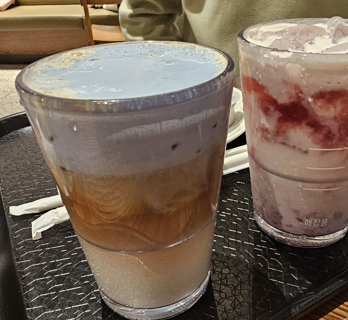 스타벅스 아이스 푸른 용 헤이즐넛 라떼가 나왔답니다~~ 우유와 에스프레소 푸른 폼 이렇게 3가지 층으로 객관적인 비주얼로는 파란색은 맛있어 보이는 느낌은 없는 것 같아요. 허허허허;;