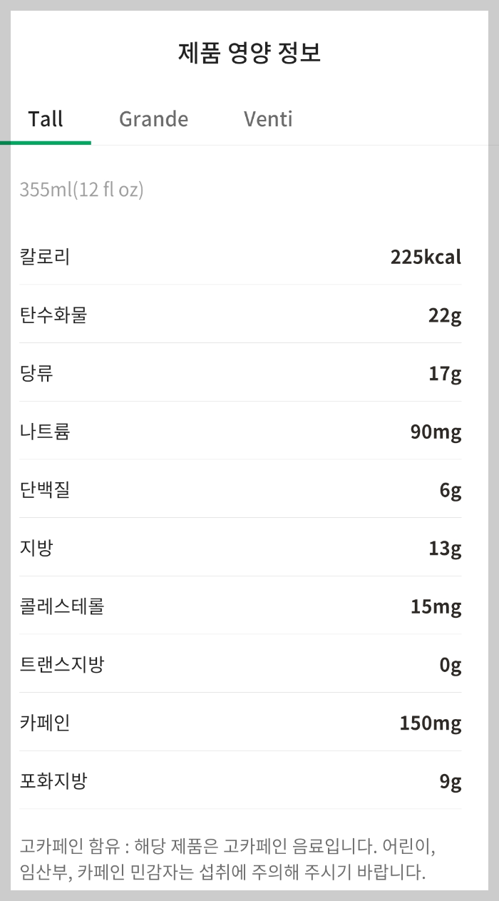 스타벅스 신메뉴인 푸른 용 헤이즐넛 라떼의 칼로리와 영양 정보를 살펴보니 톨(Tall)사이즈 기준으로 따뜻한 버전은 칼로리가 265kcal이고, 아이스는 225kcal로 아이스가 아무래도 얼음이 들어가다보니 칼로리가 낮은 편이랍니다. 카페인은 둘 다 150mg이 함유되어 있으시 참고하세요.