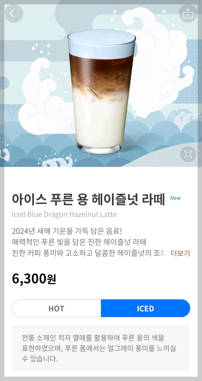스타벅스 2024년 첫 신메뉴 스타벅스 푸른 용 헤이즐넛 라떼, 개인적으로는 너무 맛있거나 맛이 없지 않고 무난한 헤이즐넛 라떼의 맛처럼 느껴졌지만, 따뜻한 푸른 용 헤이즐넛 라떼가 더 맛있을 것 같다는 생각이 들었답니다^^