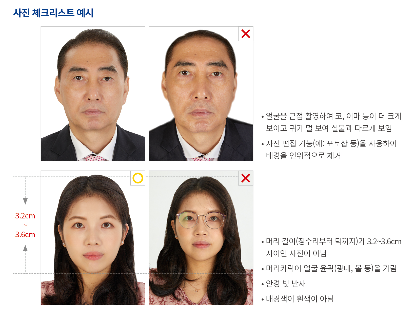 여권사진의 규격은 국제민간항공기구(ICAO)에서 정한 기준을 따르고 있습니다. 여권은 해외여행시 인정되는 유일한 신분증으로 여권에 사용되는 여권사진은 본인임을 확인하는데 매우 중요한 요소입니다. 여권사진은 여권발급 신청일 전 6개월 이내 촬영된 사진으로 본인임을 확인할 수 있도록 실제 소지인을 그대로 나타내어야 하며, 변형하여서는 안됩니다. 여권사진 규격에 적합하지 않은 사진을 제출하여 여권접수가 지연 또는 반려되거나 출입국 심사(자동출입국 시스템 포함)시 불편을 겪지 않도록 아래 기준에 맞는 적합한 사진을 제출해야합니다.