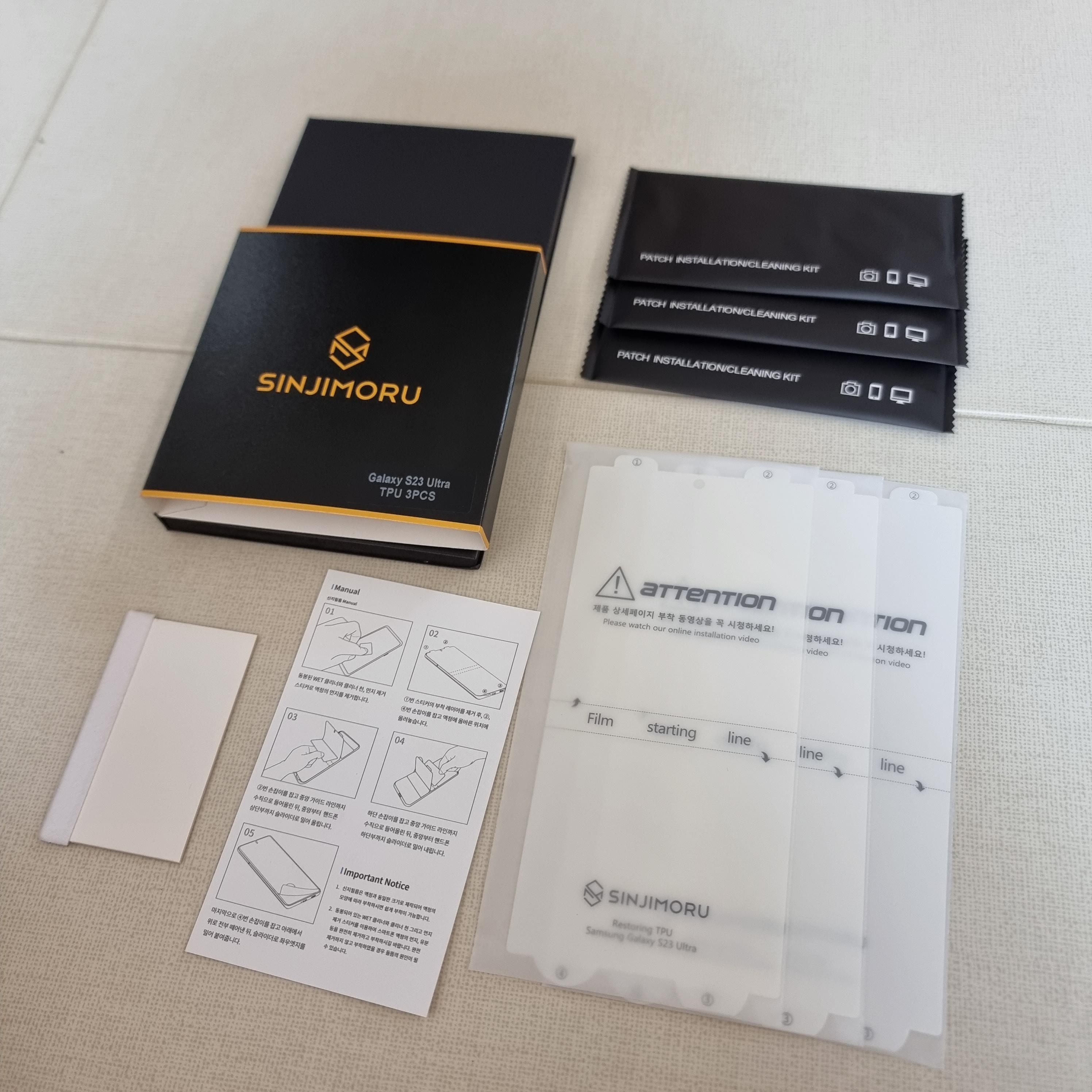 신지모루 갤럭시 S23 울트라 보호필름 구성품에는 보호필름 3장, WET 클리너 3개, 클리너 천 3개, 먼지제거 스티커 3장, 슬라이더 1개 이렇게 구성되어 있답니다.